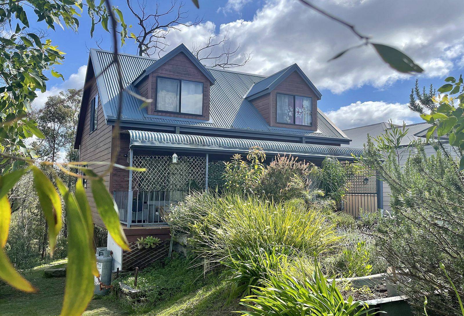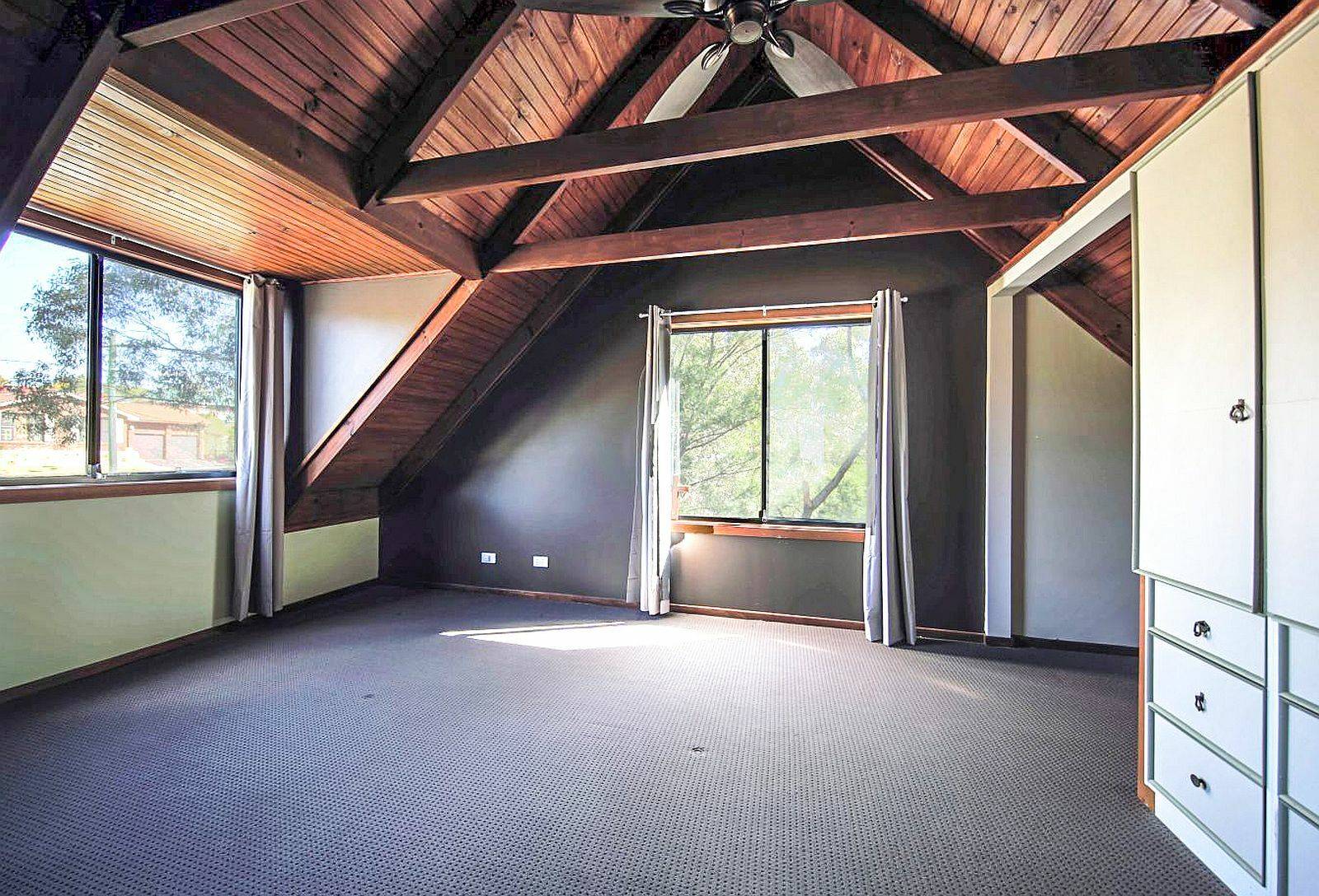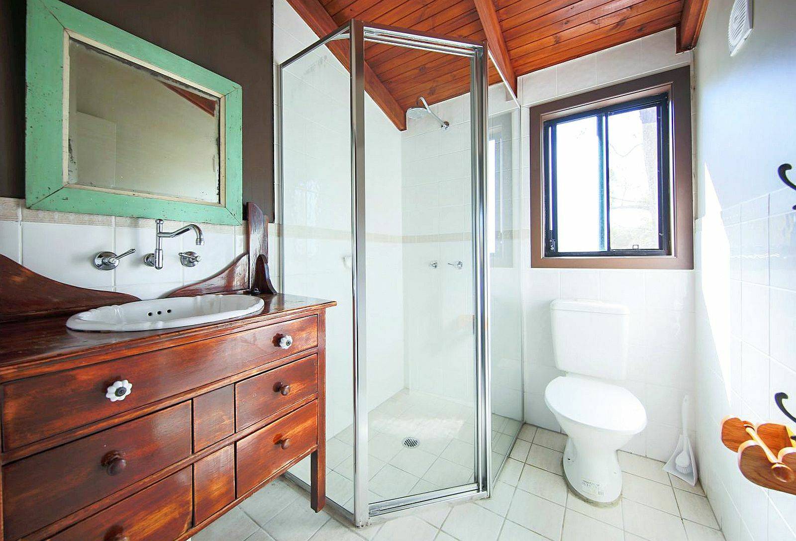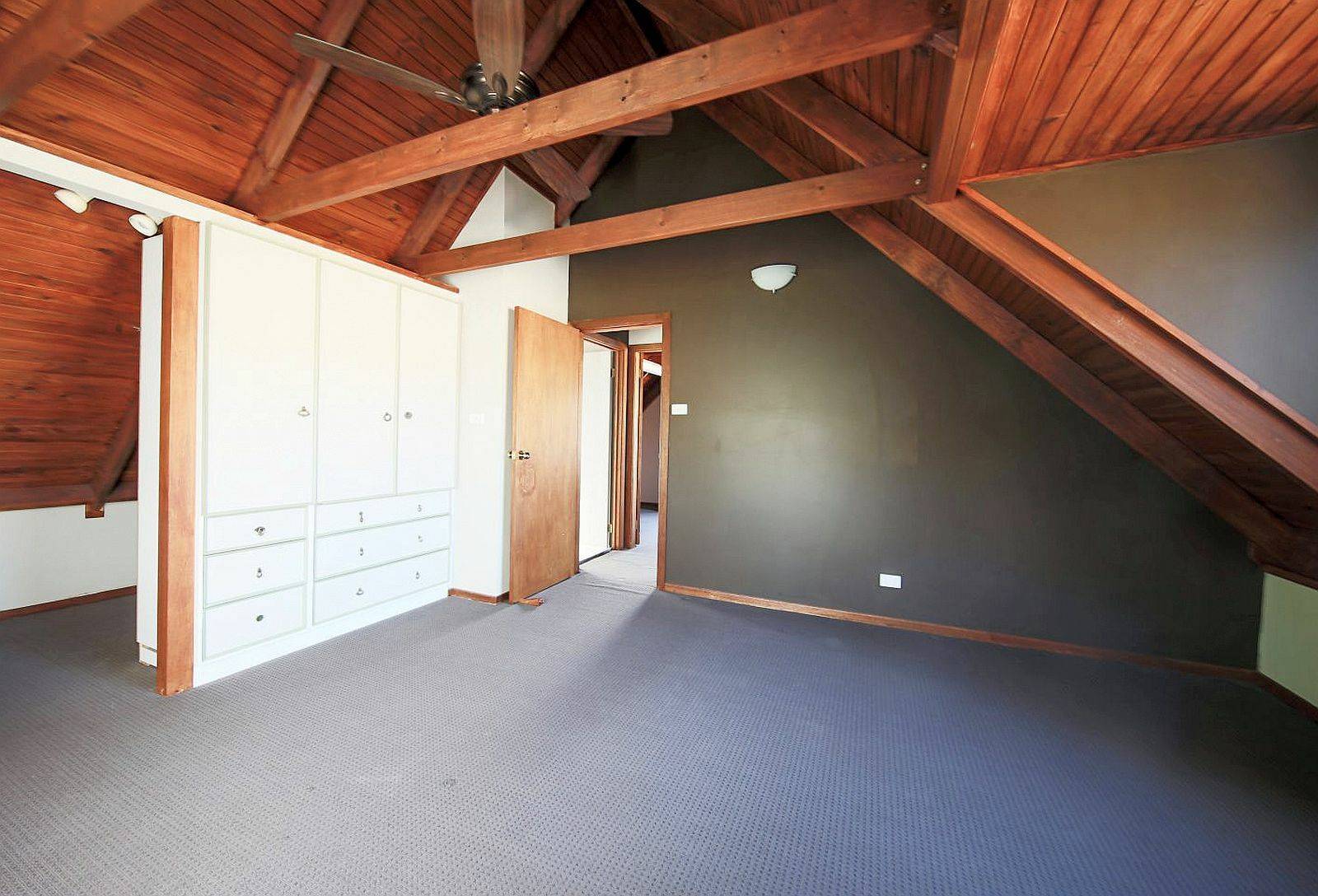 Three bedrooms in total, all with carpet flooring. Bedroom 1 is located on ground floor having built in robe. Two further bedrooms upstairs with raked & lined cathedral ceilings + ceiling fans, bedroom 2 also has a built in with drawers and a study nook. cape Cod design this home has curiosity & charm. There are tiled bathrooms on both levels and an external laundry off the rear veranda.