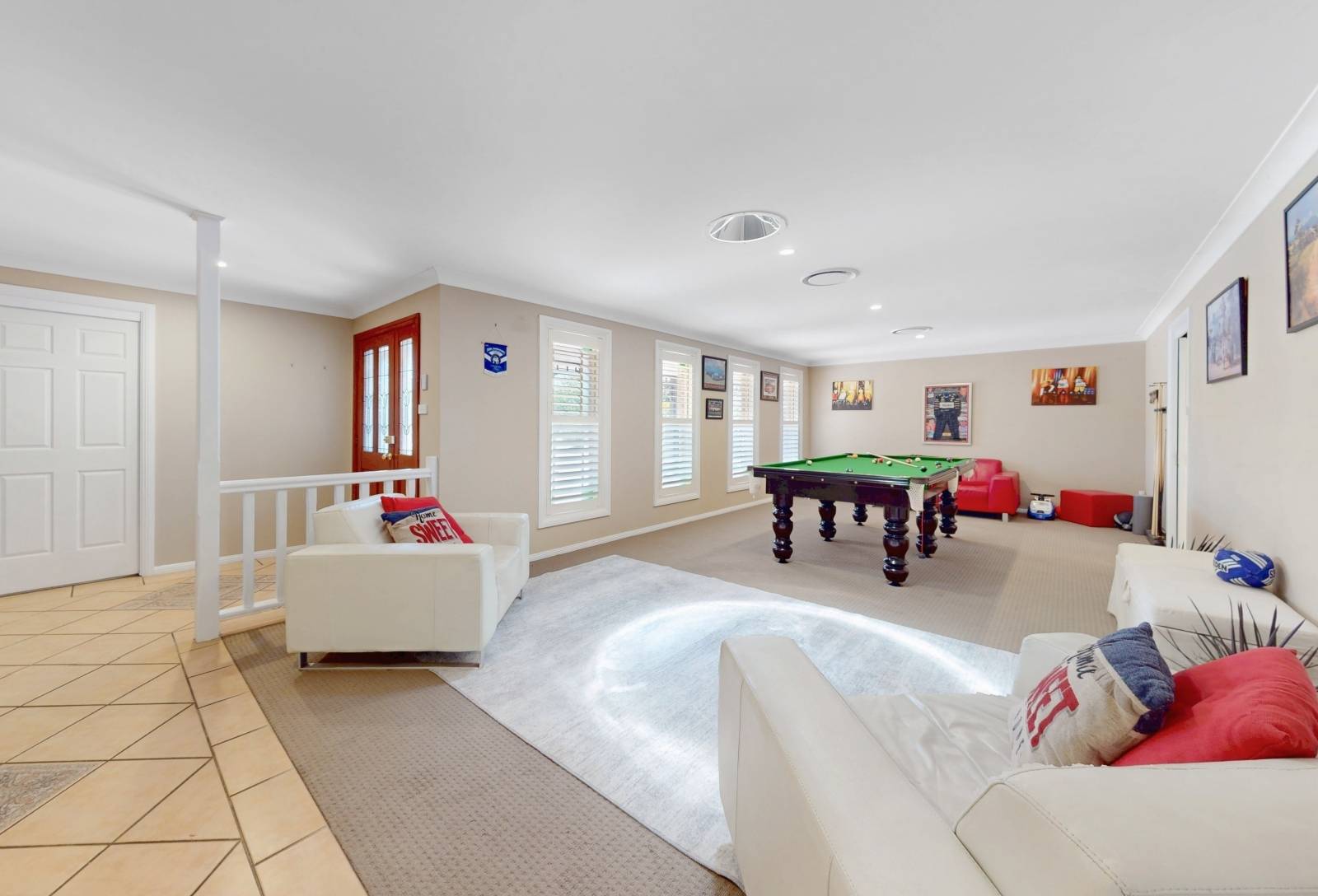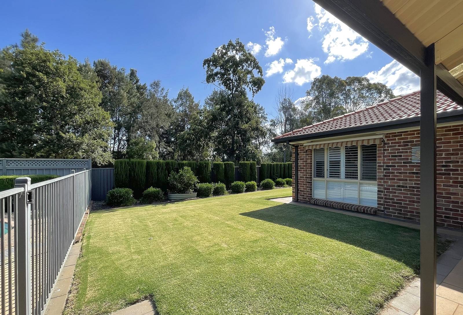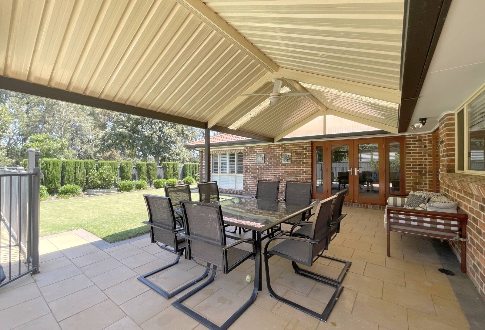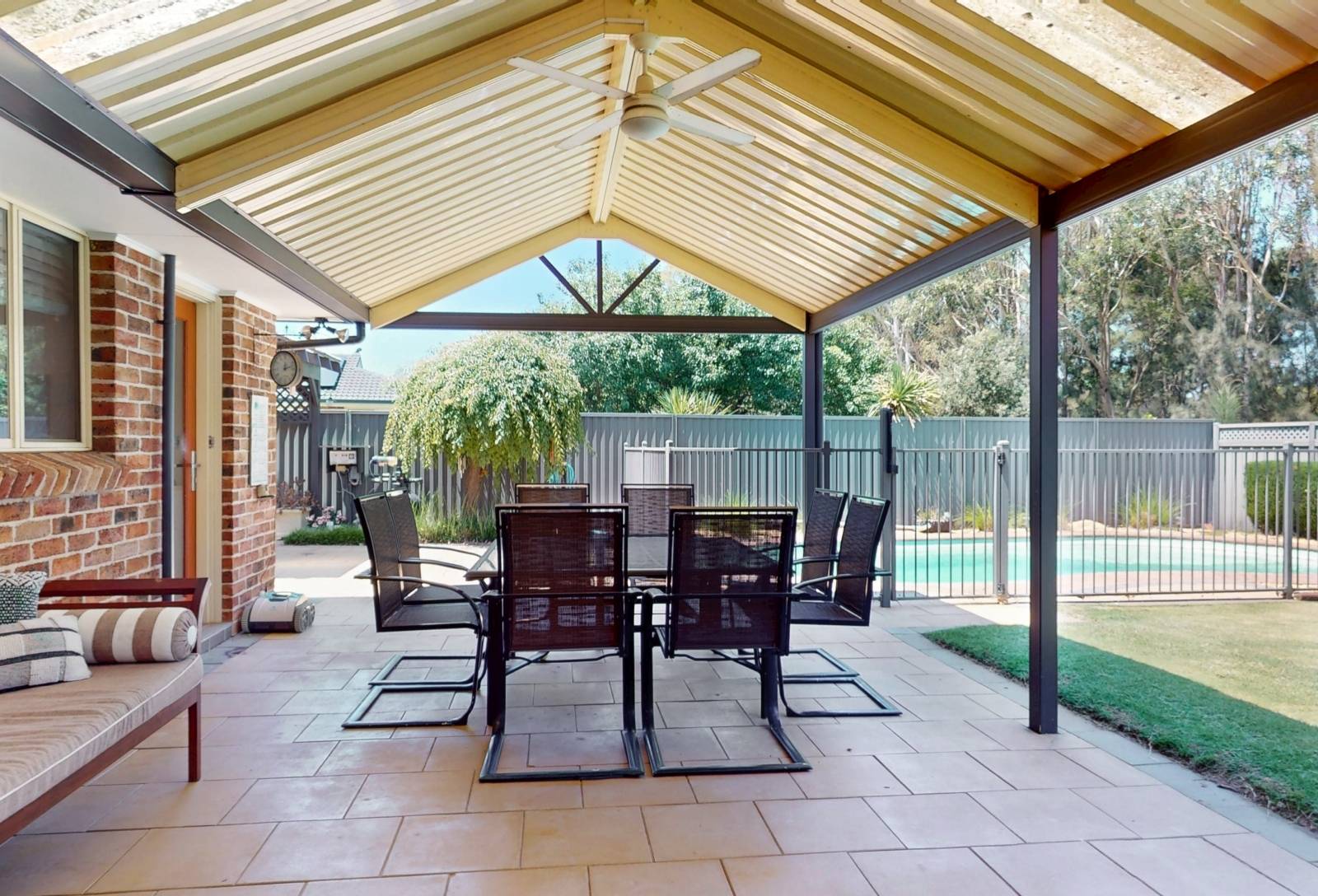 Tiled floors feature, kitchen / informal meals & centralized rumpus area. beautiful solid timber French doors allowing ease of access to expansive undercover clay paved area with pitched pergola ideal for entertainment or a BBQ with a dip in the sparkling pool on the cards, older or younger kids they'll love it. The sun will definitely shine on the rear of the property with exposure to the SW.