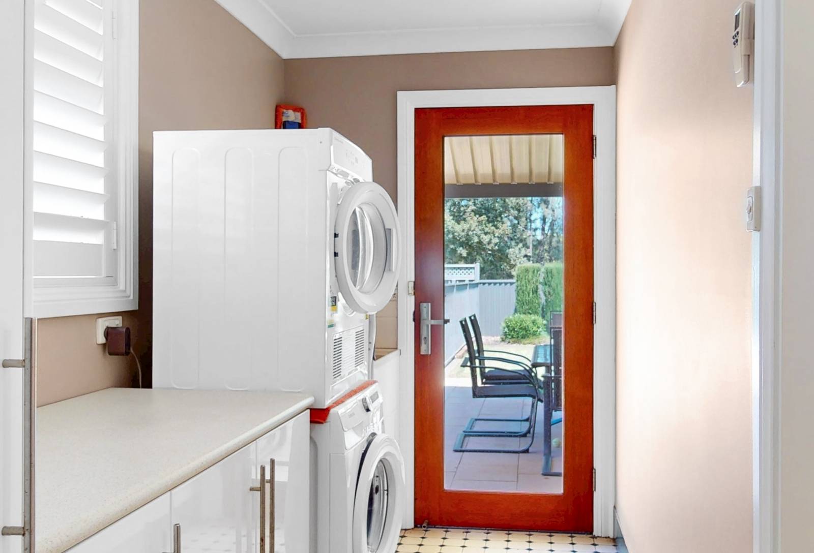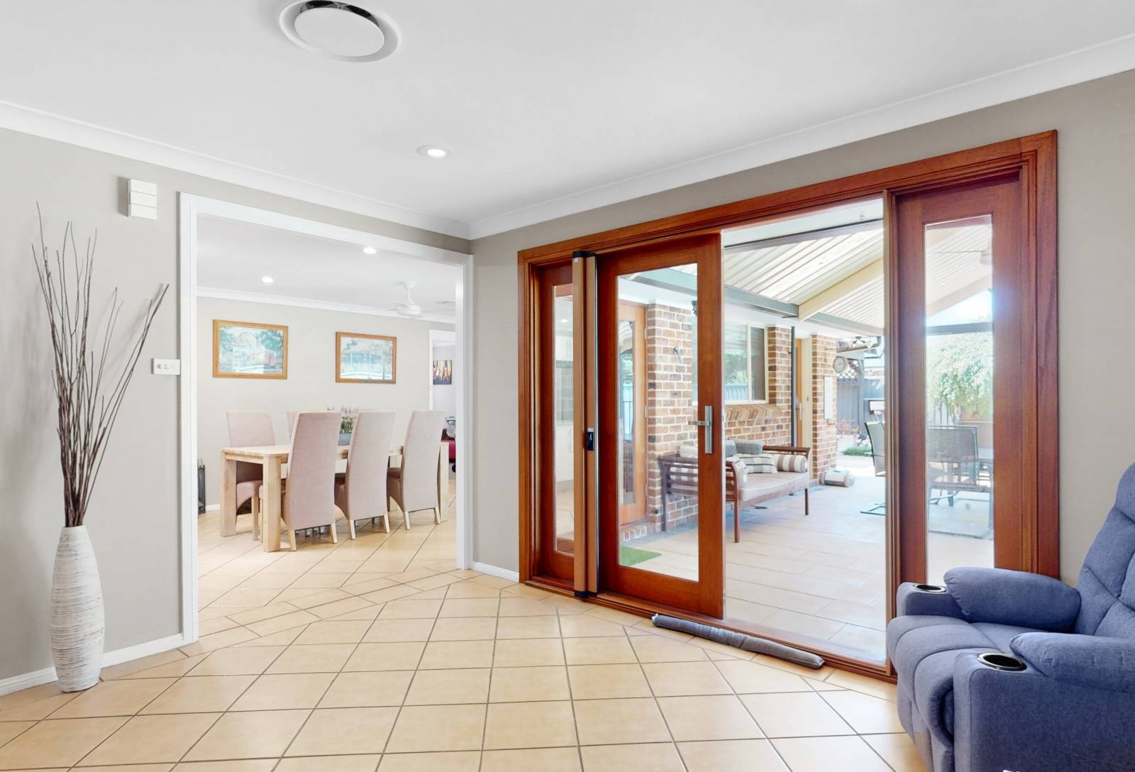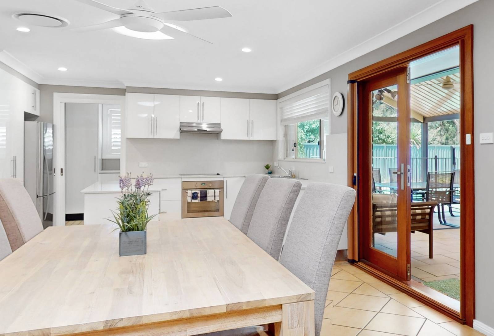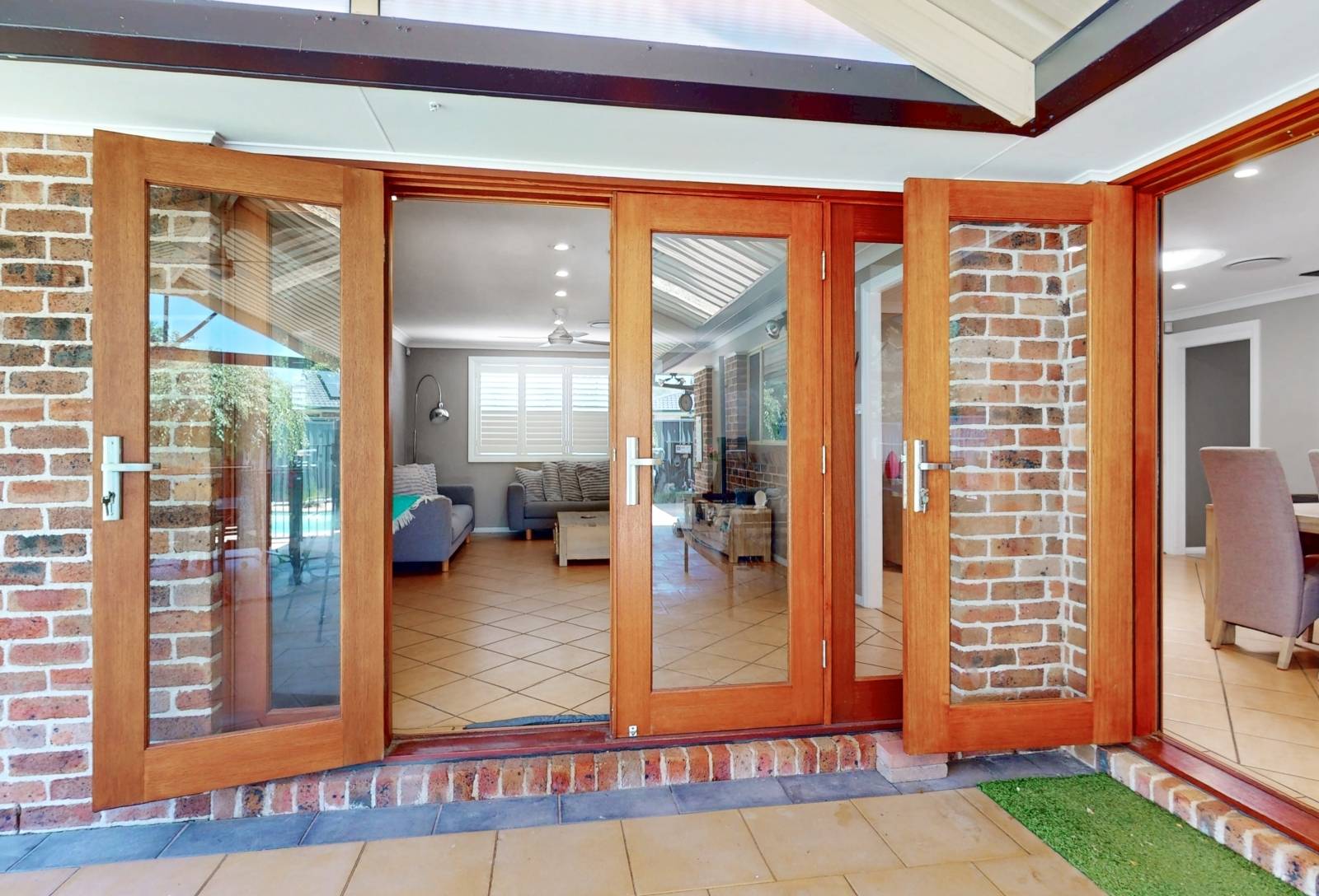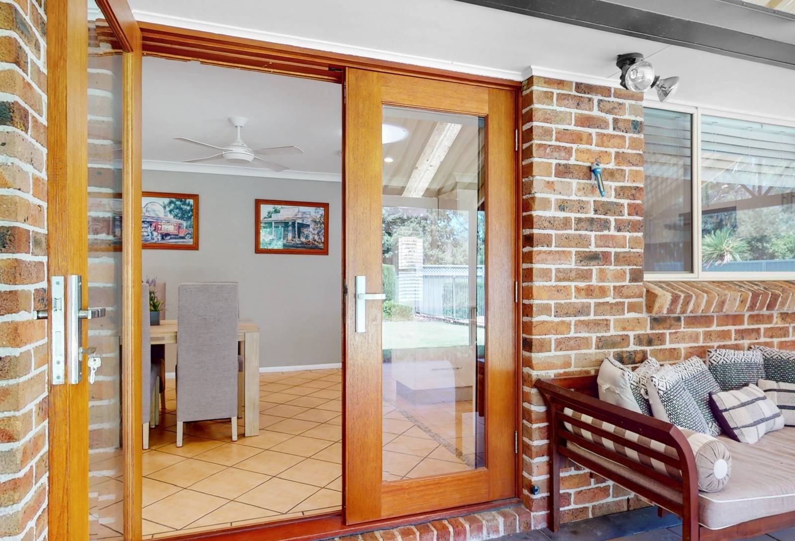 Tiled floors feature, kitchen / informal meals & centralized rumpus area. beautiful solid timber French doors allowing ease of access to expansive undercover clay paved area with pitched pergola ideal for entertainment or a BBQ with a dip in the sparkling pool on the cards, older or younger kids they'll love it. The sun will definitely shine on the rear of the property with exposure to the SW.