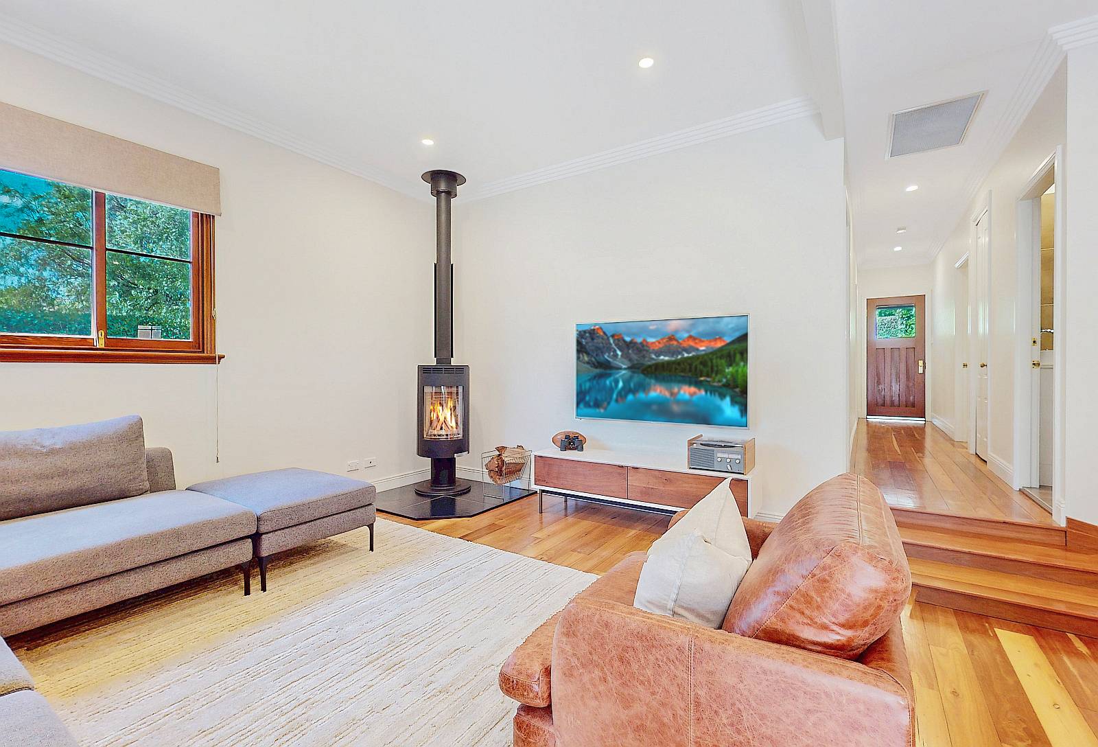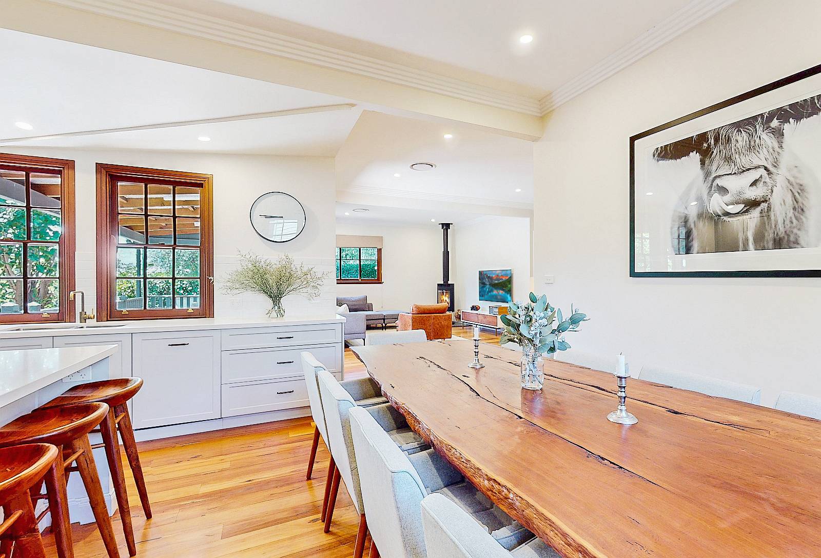 Rear to the home a delightful sun drenched formal lounge overlooks the expansive gardens along with french door access to magnificent raised timber decking with skilion roof all weather enjoyment. High ceilings feature, slow combustion heater, ducted reverse cycle air conditioning. Congregate & create to beautifully appointed kitchen, island bench prep area, dishwasher & below bench microwave nook.